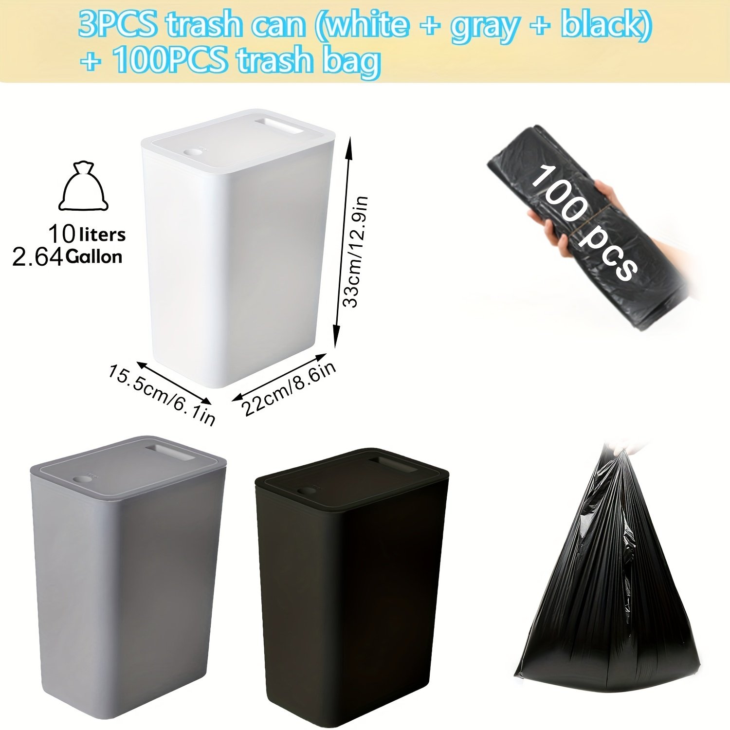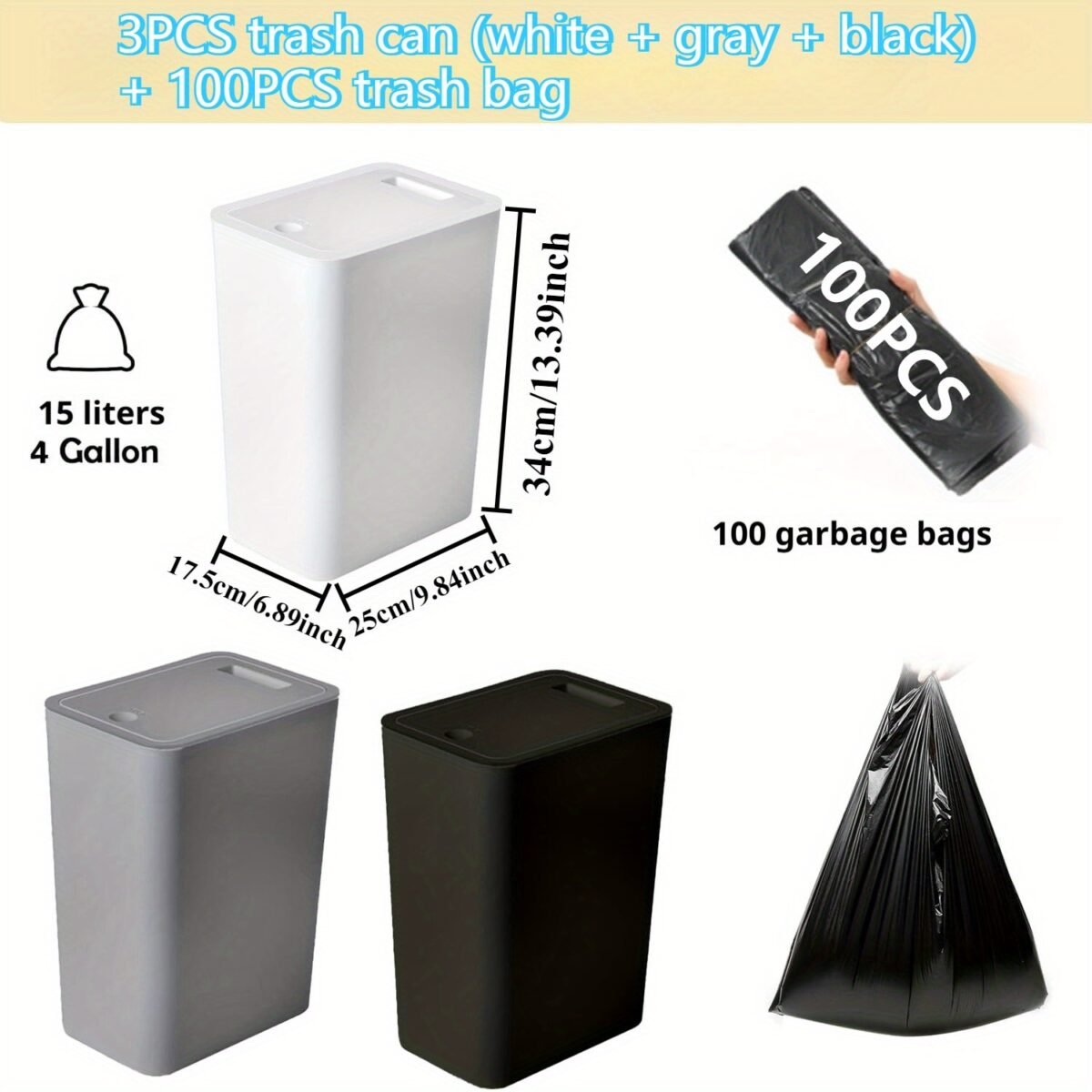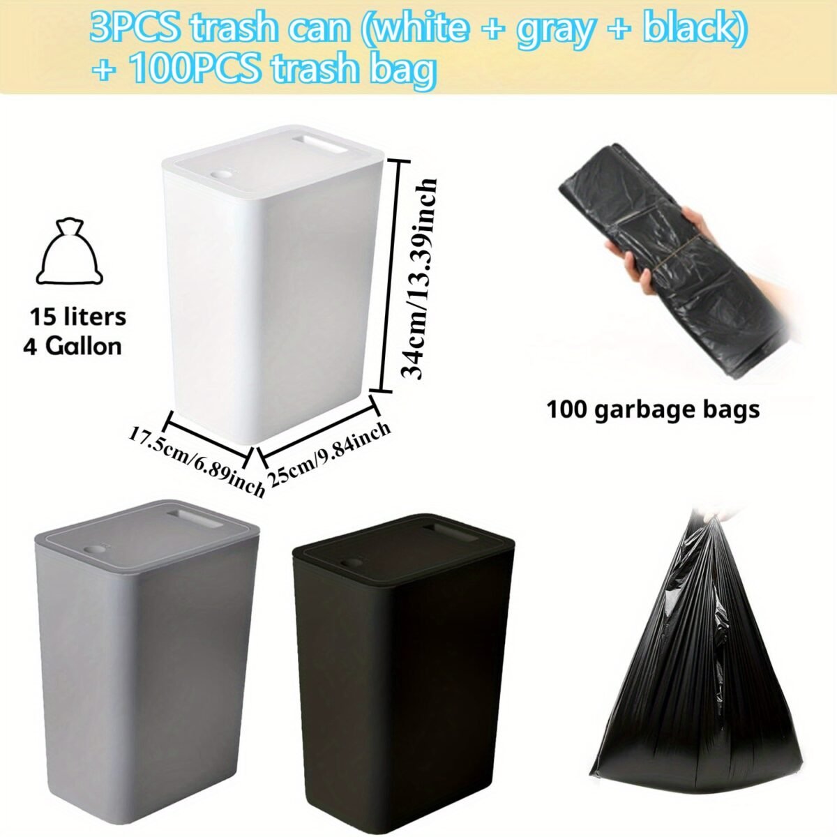 3 piezas de cubo de basura de 15L con tapa sellada, antideslizante, antiolor y silencioso, universal para baño, cocina, dormitorio, incluye más de 100 bolsas de basura gratis.