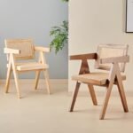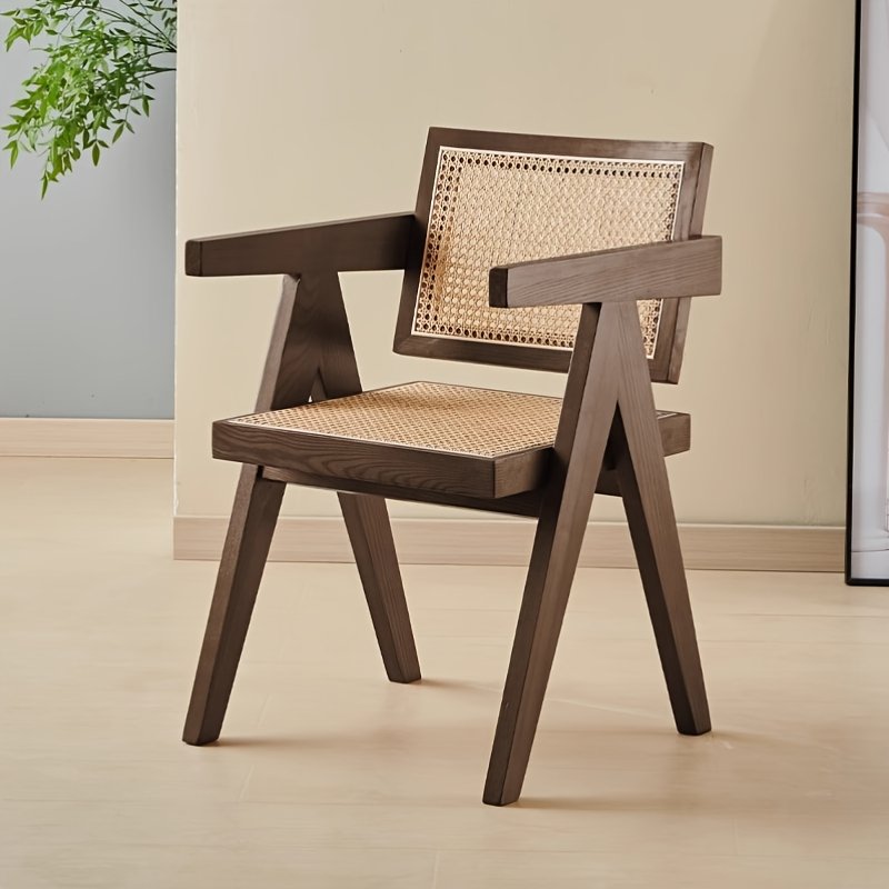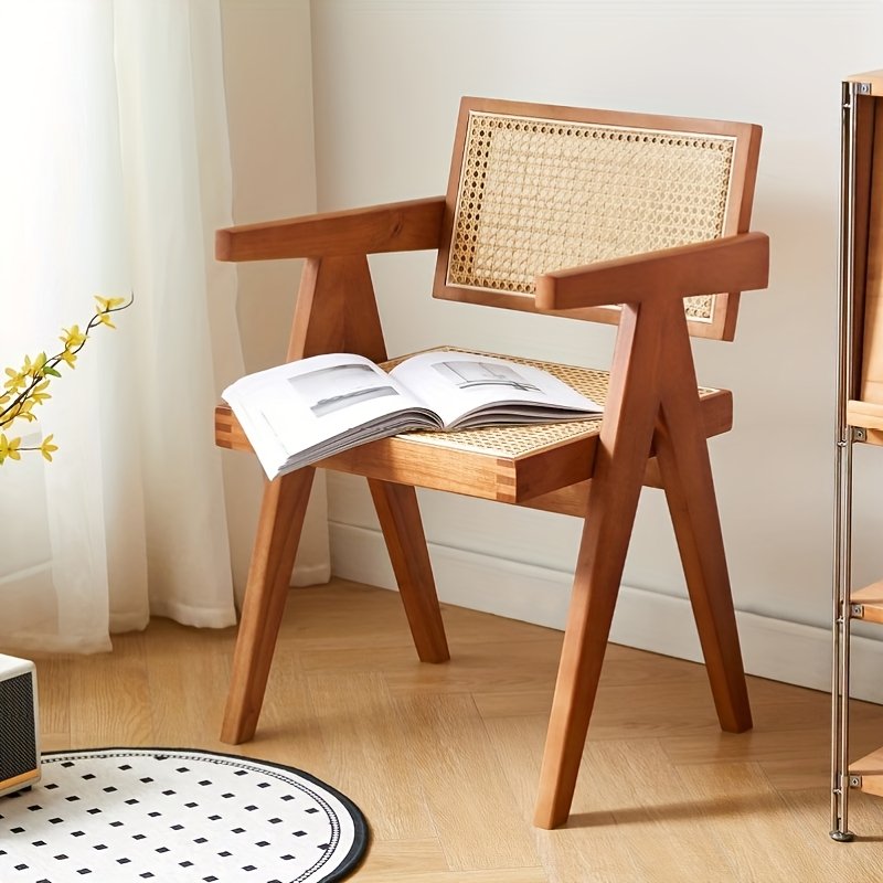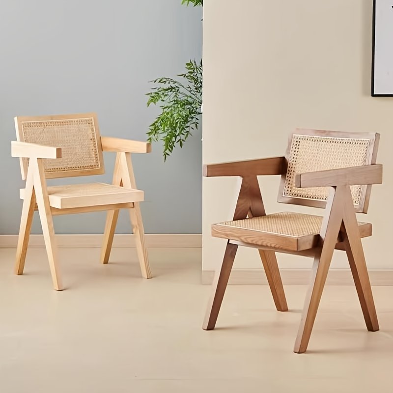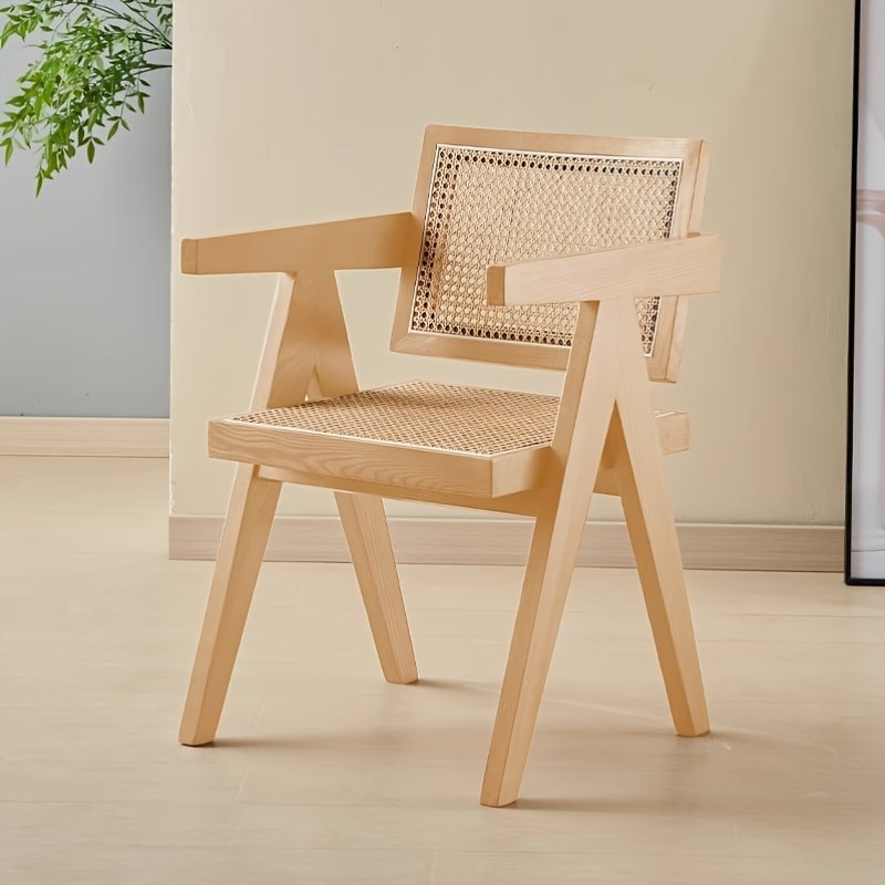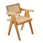 Silla de diseño moderno y elegante, ideal para interiores como comedores, salas de estar u oficinas en casa. Su estructura de madera maciza de tono natural y respaldo en mimbre natural le aporta un estilo artesanal, cálido y sofisticado.